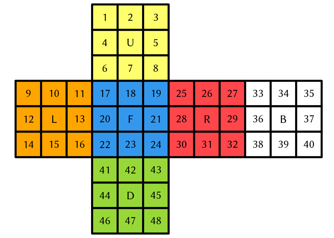Rubik’s Cube has six faces, coloured red, orange, yellow, green, blue, and white. The cube has 26 pieces: 8 corner pieces, 12 edge pieces, and 6 centre pieces. In the diagram above, the faces are labelled L, R, U, D, B, and F, which stand for left, right, up, down, back, and front, respectively. We consider the cube remaining in a fixed orientation, so that for example the blue centre piece, which is labelled F, continues to face towards the front. One sees from the net of the cube, shown below, that the three opposite pairs of faces are red/orange, yellow/green, and blue/white.