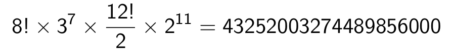 The exact formula for the number of symmetries is shown above. To understand where this comes from, it helps to consider the effect of each symmetry on the 8 corner pieces and the 12 edge pieces, as shown below. An important feature of these pieces is that each each corner piece has three possible orientations, and each edge piece has two possible orientations. It turns out that the 8 corner pieces can be rearranged into any order using a sequence of legal moves. Furthermore, it is possible to orient any 7 of the 8 corner pieces arbitrarily, but the orientation of the 8th corner is then fixed. This gives a total of 8! × 37 combinations (where ! denotes factorial).