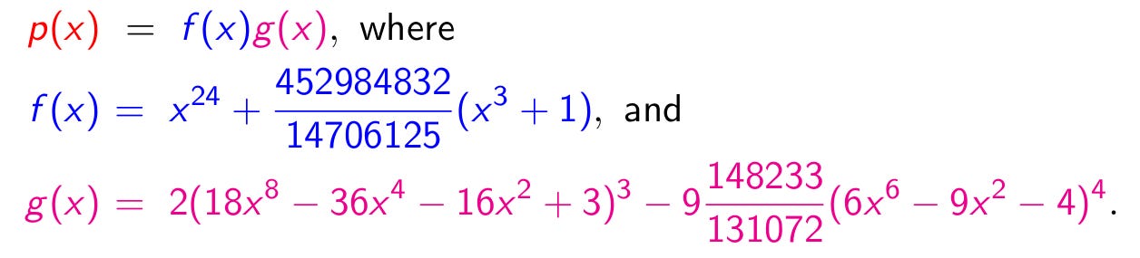 A major unsolved problem in algebra is the inverse Galois problem, which asks whether any finite group of symmetries can be realized as the symmetries of a polynomial whose coefficients are rational numbers. The recent paper Rubik's as a Galois' by M. Mereb and L. Vendramin proves that the answer is yes in the case of symmetries of Rubik’s Cube. In other words, there is a polynomial with rational coefficients whose roots have the same symmetries as the Rubik’s Cube. Even better than that, the paper gives an explicit example of such a polynomial, namely the one shown above.