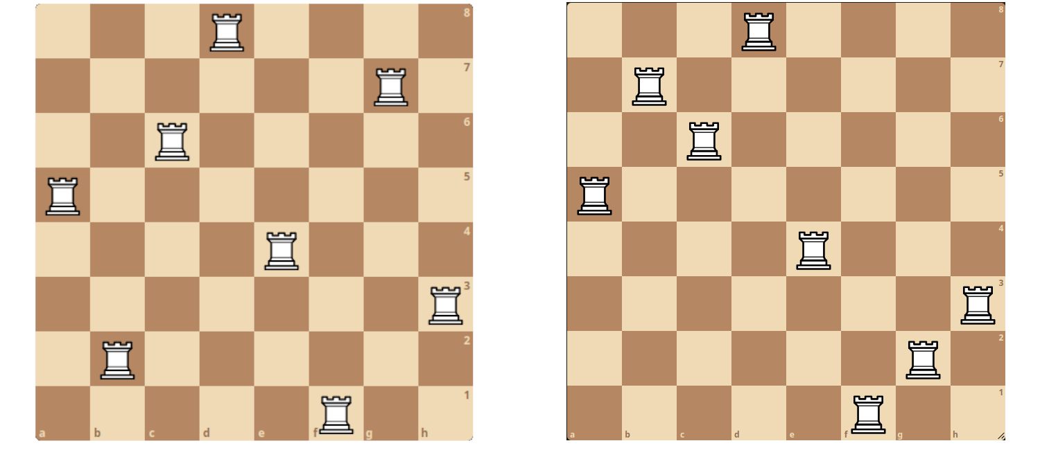 This is a disguised version of the homework problem with 8 students, where the students are labelled A to H, the homework assignments are labelled 1 to 8, assignment 1 belongs to student A, assignment 2 belongs to student B, and so on. Both chess arrangements have a rook on A5, which corresponds to student A receiving assignment 5. However, the arrangement on the left does not correspond to a derangement, because, students B and G receive their own work back (B receives 2 and G receives 7). In contrast, the arrangement on the right is a derangement, as can be seen by the absence of a rook on the diagonal connecting A1 to H8.