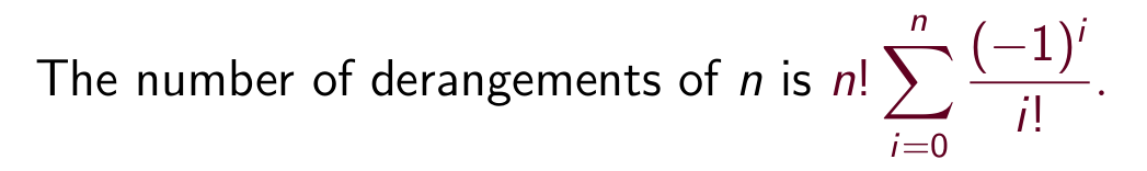 The formula for the number of derangements of n is shown above. In the case n=4, this works out as 24×(1 - 1 + ½ - ⅙ + 1/24), which is 9. You may recognize the formula as the power series expansion for n!/e, and indeed the formula converges to n!/e very quickly. For example, if n=11, then the number of permutations of 11 objects is 11 factorial, or 39,916,800, and the number of derangements is 14,684,570. Dividing the first number by the second gives 2.71828182842…, which agrees with e to 10 decimal places.