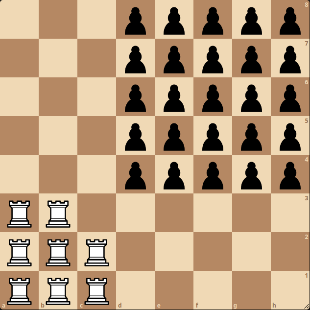 Now suppose that we place n rooks on an n by n board with no constraints, meaning that two rooks are allowed to be in the same row or column, so long as they are on different squares. A problem that is related to, but more difficult than the previous one is to determine the expected number of safe squares in this situation, meaning squares that are not attacked by any of the rooks. If there is a rook in each row and column, then there will be no safe squares. Other configurations may have many safe squares, such as the configuration of 8 rooks shown above, which has 25 safe squares, shown by the locations of the pawns. This problem was solved in the 2021 paper When Rooks Miss: Probability through Chess by Steven J. Miller, Haoyu Sheng, and Daniel Turek. The answer turns out to be that the expected number of safe squares is n2/e2. In other words, the probability that a random square will be safe in a random configuration of n rooks converges to 1/e2 (about 13.5%) as n tends to infinity.