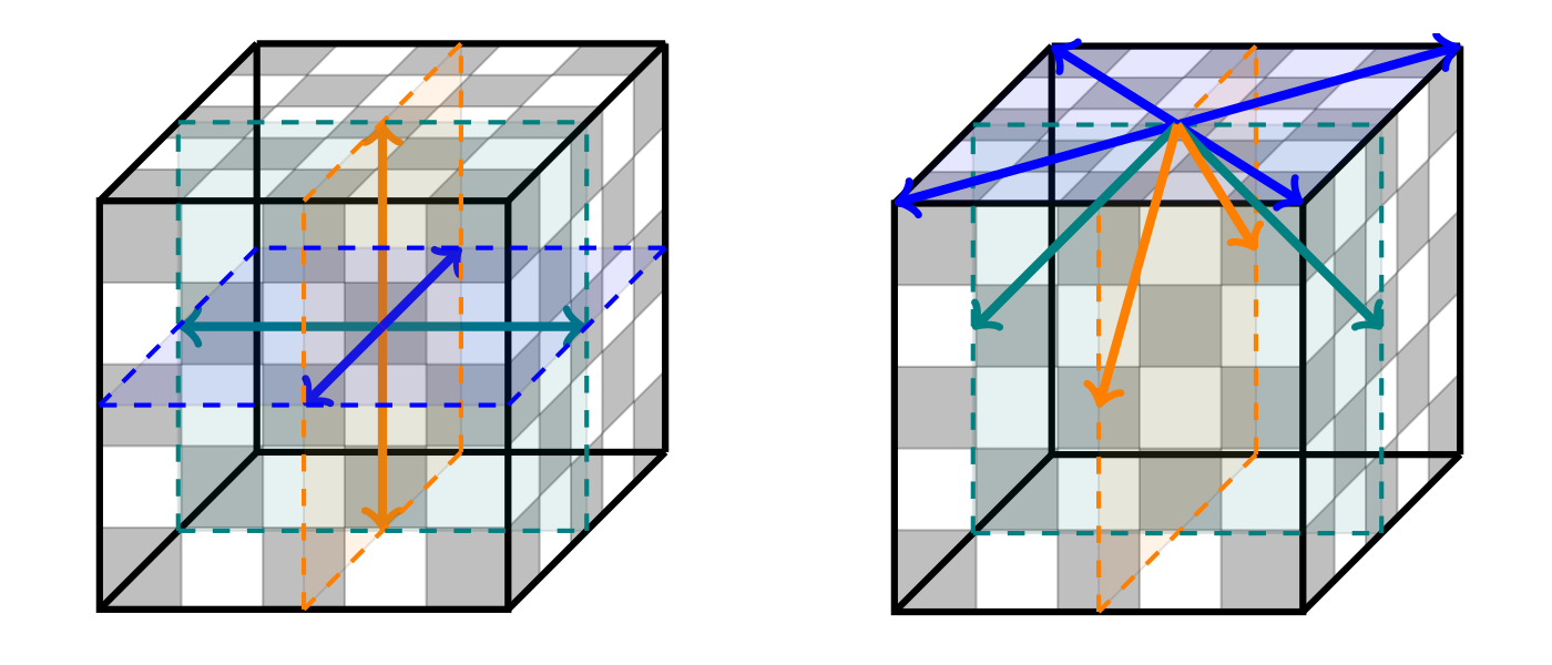 The recent paper Hyper-bishops, Hyper-rooks, and Hyper-queens: Percentage of Safe Squares on Higher Dimensional Chess Boards by Caroline Cashman, Joseph Cooper, Raul Marquez, Steven J. Miller, and Jenna Shuffelton gives many generalizations of the safe squares problem for rooks. In particular, the authors solve the corresponding problem for bishops and for queens. The analysis is made more difficult by the fact that a rook attacks the same number of squares no matter where it is placed on the board, whereas this is not the case for bishops or queens. Despite this complication, the conclusion is similar to the conclusion for the rook problem: the proportion of safe squares for n randomly placed pieces on an n by n chess board converges to 2/e2 if the pieces are bishops, and 2/e4 if the pieces are queens. The paper also studies a variety of k-dimensional versions of the problem involving generalized pieces such as “line rooks” and “line bishops”, which move according to the rules shown above.