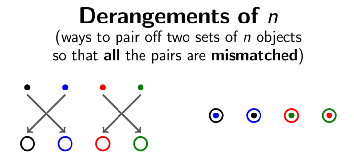 One surprising appearance of e is in the context of derangements. A derangement is a permutation of n objects with the property that each object is moved to a different one. Equivalently, imagine a situation in which a teacher randomly hands back n homework assignments to the n students who submitted them. A derangement corresponds to a situation in which every student receives the wrong assignment back. The animation above illustrates the homework assignment problem in the case n=4. In this case, the four coloured dots represent the four homework assignments, and the four coloured circles represent the corresponding students.