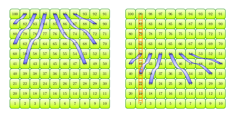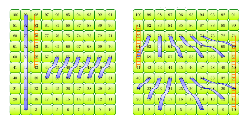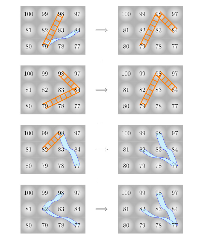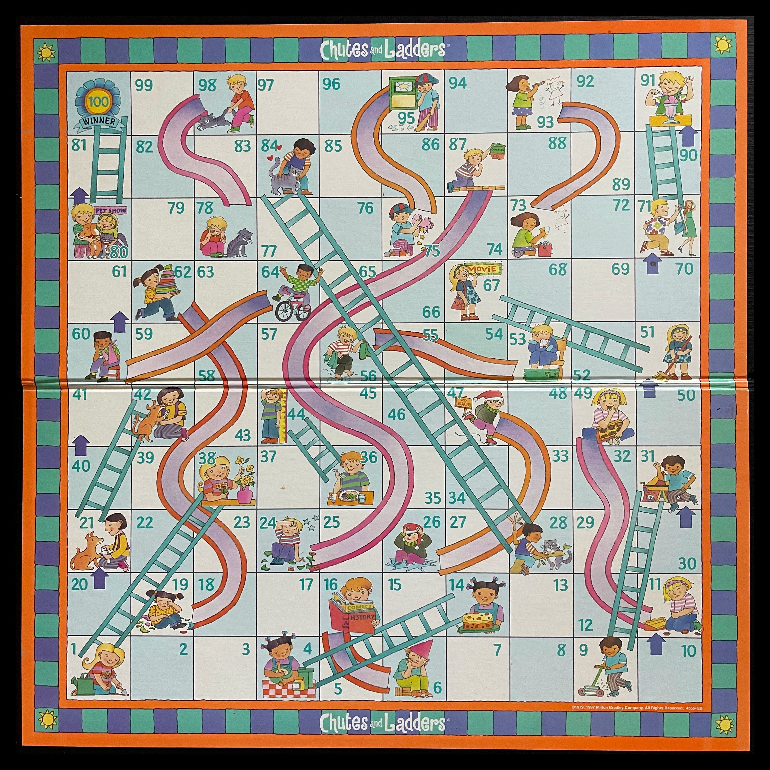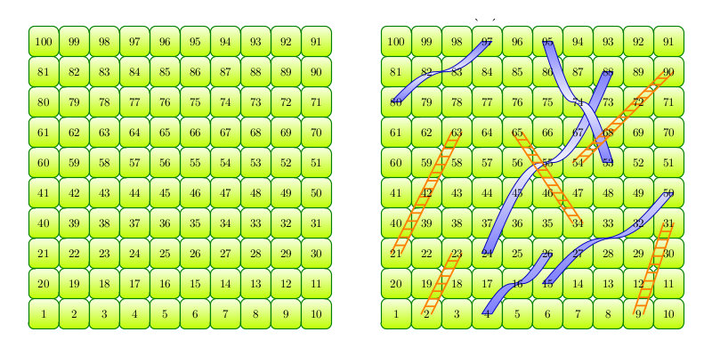 The classic board game of Snakes and Ladders (or Chutes and Ladders) originated almost 2000 years ago in India, where it is known as Moksha Patam (see below). A turn of the game consists of a player throwing a random number between 1 and 6, and advancing a token by that number of squares. If the token ends up at the top of a snake (or chute) then the to…