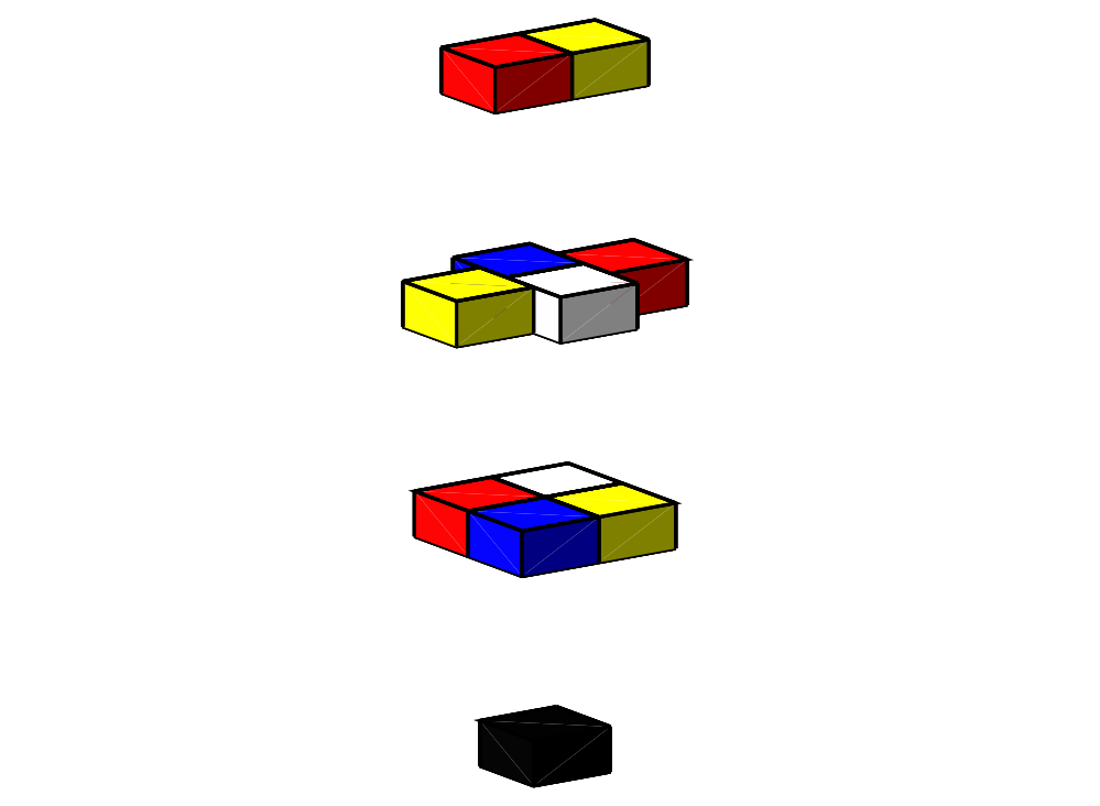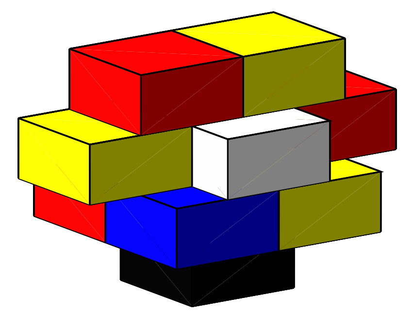 The paper uses the notation χ2(a,b,c) to denote the optimal number of colours where the cuboids are all oriented in the same plane, but where they are allowed to lie at right angles to each other. The picture shows an example of such a configuration for 2×1×1 cuboids. The fact that χ1(2,1,1)=3 immediately implies that χ2(2,1,1) is at least 3, but the example in the picture above, which requires five colours, demonstrates that in fact χ2(2,1,1) is at least 5. The authors also prove that χ2(2,1,1) is exactly 5, meaning that five colours suffice for any such stack of 2×1×1 cuboids.