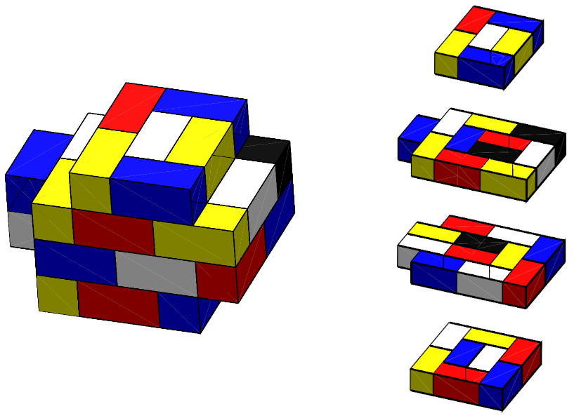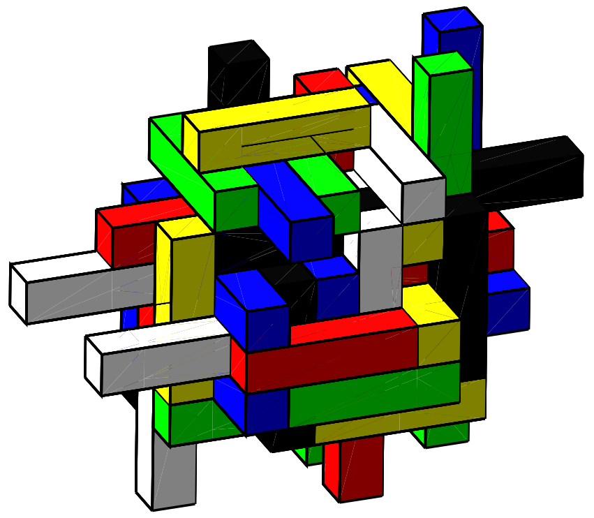 The paper takes things one step further and defines χ3(a,b,c) as the optimal number of colours for a stack of a×b×c cuboids with arbitrary orientations. In this case, it is no longer possible to explode the arrangement into layers, which makes things harder to visualize and to communicate. The arrangement shown above, which consists of 56 cuboids of size 4×1×1, turns out to require six colours. This proves that χ3(4,1,1) is at least 6. The paper establishes an upper bound of 12 for χ3(4,1,1), but the exact value is not known.