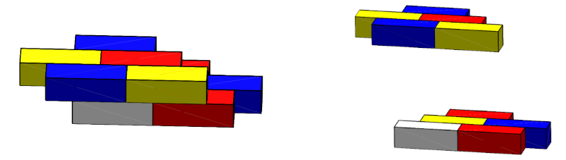 In the case of 3×1×1 cuboids that are oriented in the same direction, the authors prove that the answer is four, and that the picture above gives an example where four colours are required. A slightly more complicated argument can be used to prove that four colours are required to colour this particular example. Once again, proving that an arbitrary stack of 3×1×1 cuboids can be coloured with four colours is much harder, although the authors do prove this in the paper.