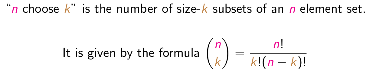 How many ways can we choose three lines that intersect at the point A? There is a total of a+2 lines emerging from A: the a cevians, and the two edges AB and AC. The number of ways of choosing 3 objects from a total of a+2 is given by the binomial coefficient “(a+2) choose 3”, as defined above. There are similar formulas for the number of ways that three lines can meet at B or at C.