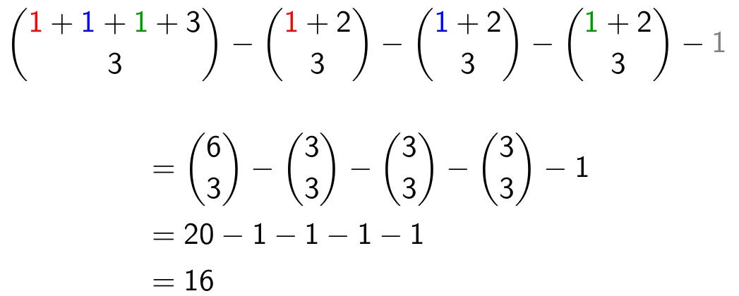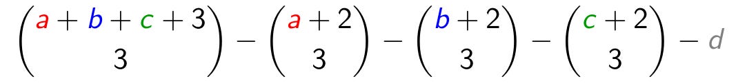To count the total number of triangles, we start by counting the number of ways to select the three bounding lines. The total number of lines in the picture is a+b+c+3, because we need to count the three edges of the big triangle as well as all the cevians. The number of ways to select three of these lines is the first term of the formula, “(a+b+c+3) choose 3”. We then need to subtract all the collections of three lines that can meet at a point. This explains the other four terms in the formula, because three such lines can either meet at A, or at B, or at C, or at one of the internal points of the triangle. In the example at the top, a, b, c, and d are all equal to 1, and the formula above confirms that the total number of triangles is 16.