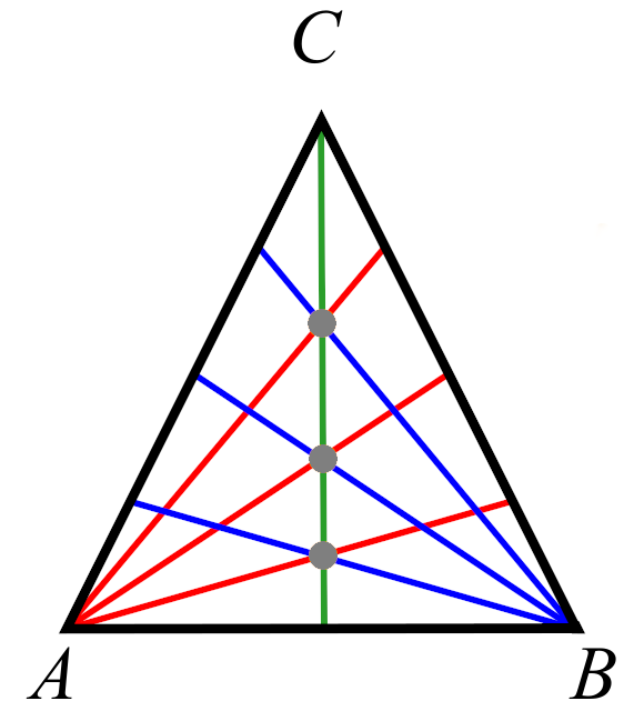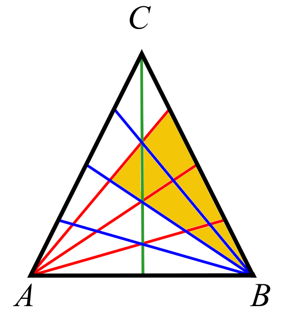 The recent paper Counting Triangles in Triangles by Jim Propp and Adam Propp-Gubin gives a formula for the number of triangles formed by dividing up a larger triangle ABC using cevians. A cevian is a straight line connecting a corner of the triangle to a point on the opposite edge. We define a, b, and c to be the numbers of cevians emerging from points A, B, and C respectively. For example, the picture above shows the case where a=3, b=3, and c=1.