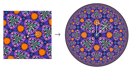 Given a repeating wallpaper pattern in the Euclidean plane, is there a good algorithm to turn it into a wallpaper pattern in the hyperbolic plane, as in the Circle Limit series of pictures by M.C. Escher? According to the recent paper The Smooth Power of the "Neandertal Method" by Aaron Montag, Tim Reinhardt, and Jürgen Richter-Gebert, the answer is “yes”. The authors show how to use the relatively simple “Neandertal method” to produce mathematically sound and aesthetically pleasing results, like the one in the picture above, without the need for time-intensive computations.