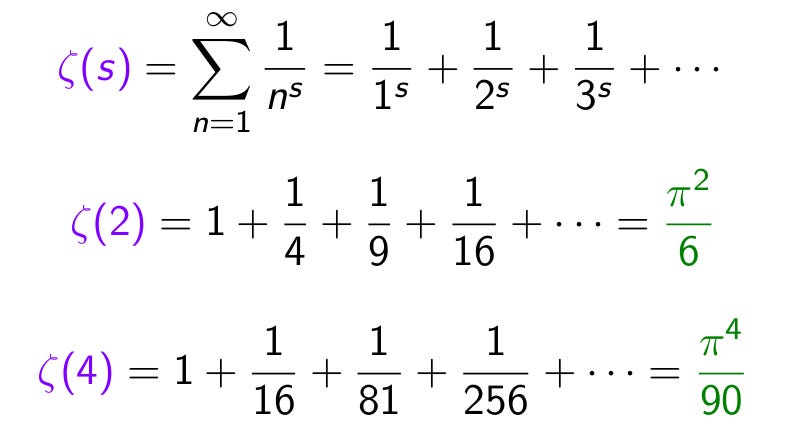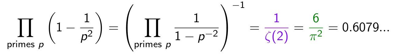 To understand where the number 6/π2 comes from, it is helpful to recall that π2/6 is the infinite sum of the reciprocals of the square numbers: 1 + 1/4 + 1/9 + 1/16 + … This was first proved by Leonhard Euler in 1734. This result can be generalized: if k is an even integer, then the sum of the reciprocals of the k-th powers of n is a rational multiple of πk. For example, if k=4, then the infinite sum 1 + 1/16 + 1/81 + 1/256 + … turns out to be the transcendental number π4/90.