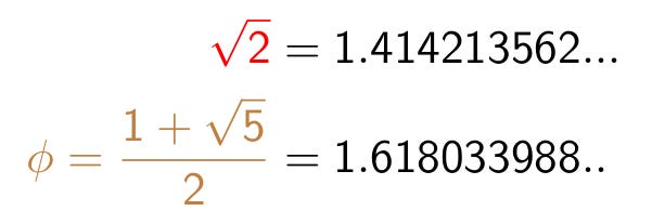 Another example of an irrational algebraic number is the golden ratio, φ=(1+√5)/2, which is a root of the polynomial x2–x–1. It is a nontrivial theorem that the number π is transcendental, which means that it is not a root of any polynomial with integer coefficients. Intuitively, this means that π is not just irrational, but “very irrational”.