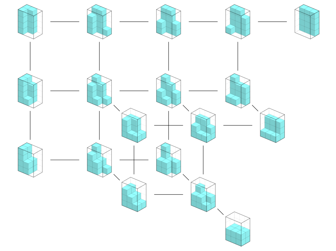 These pictures come from the recent paper Flip Graphs on Self-Complementary Ideals of Chain Products by Serena An and Holden Mui. In this context, a chain consists of a set of numbers {1, 2, …, n}, ordered by ≤ in the usual way; such a chain is denoted by [n] for short. A product of chains would then be something like [a]×[b]×[c], where the numbers a, b, and c may or may not be the same. This can be thought of as an a×b×c box, whose positions are ordered relative to the bottom back corner as described in the first paragraph.