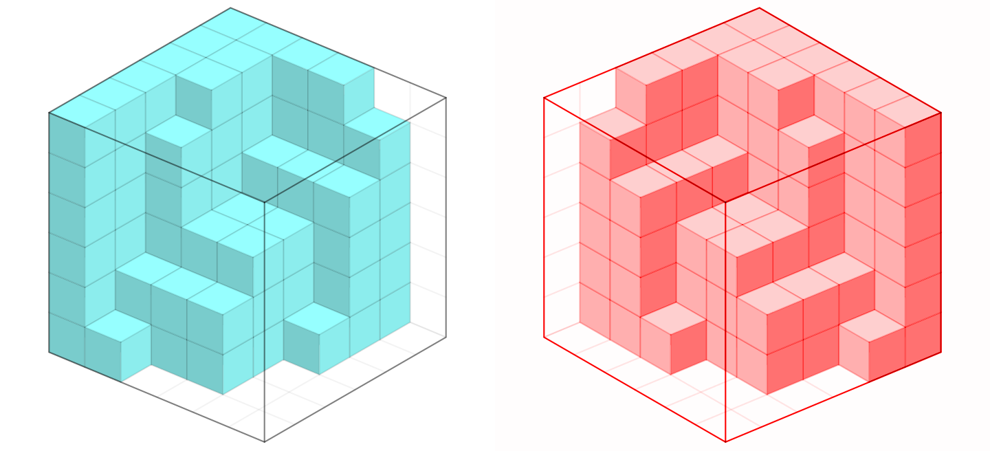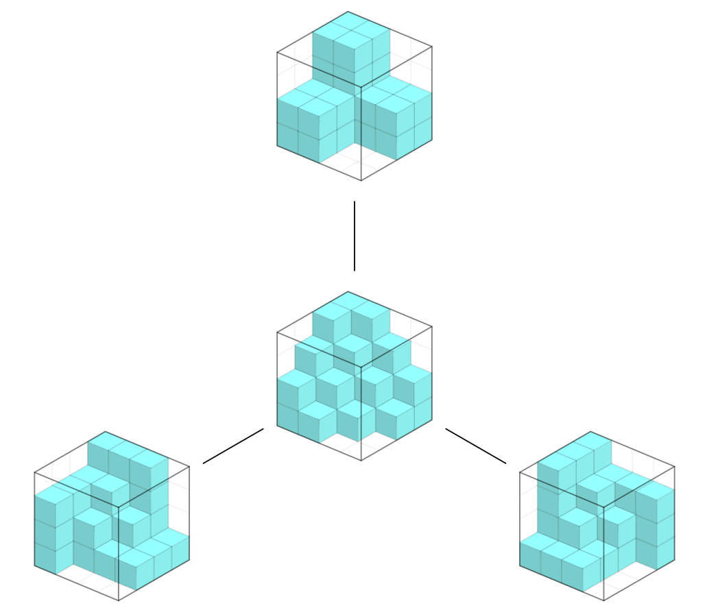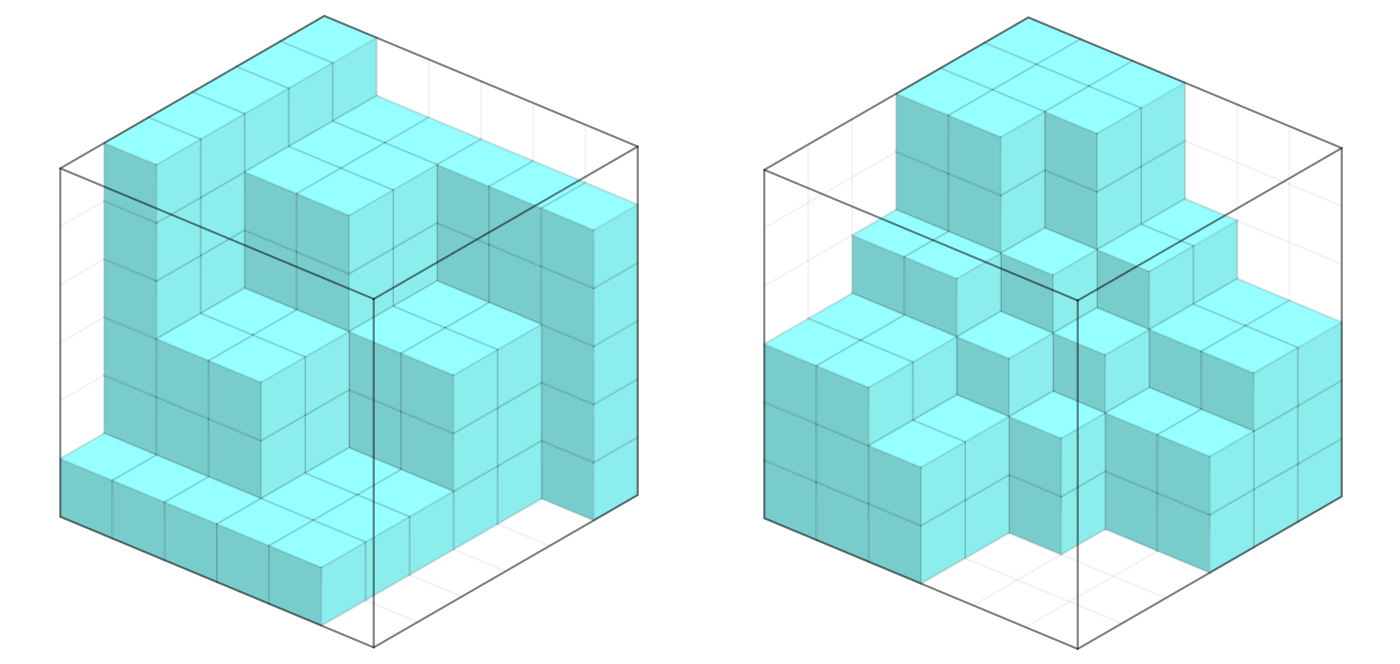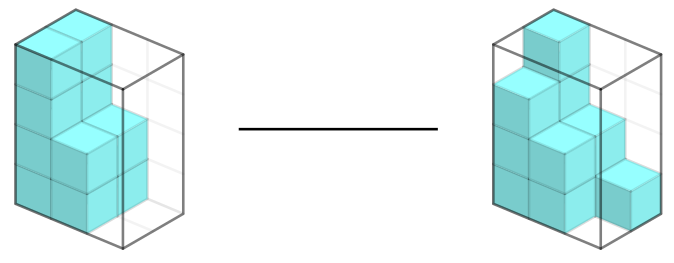The blue picture above can be thought of as a collection of cubes of unit side length stacked in a 6×6×6 box. If two cubes touch face to face, then the cube that is closest to the bottom back corner is defined to be the smaller one, which endows the set of 63 positions in the box with the structure of a partially ordered set (or poset for short). The set of occupied positions in the box forms an ideal, which means that if a position in the box is occupied, then we require all smaller positions to be occupied too. Informally, this means that the cubes are required to be stacked flush into the bottom back corner.