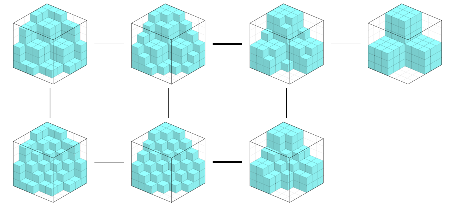 The authors also study the analogues of flip graphs for cyclically symmetric self-complementary ideals (shown above) and totally symmetric self-complementary ideals (shown below). In these cases, one needs to move more than one cube at a time to retain the symmetry properties, so two ideals are joined by an edge if they differ by the smallest possible number of cubes. A thicker edge denotes a situation where relatively many cubes are moved at once.