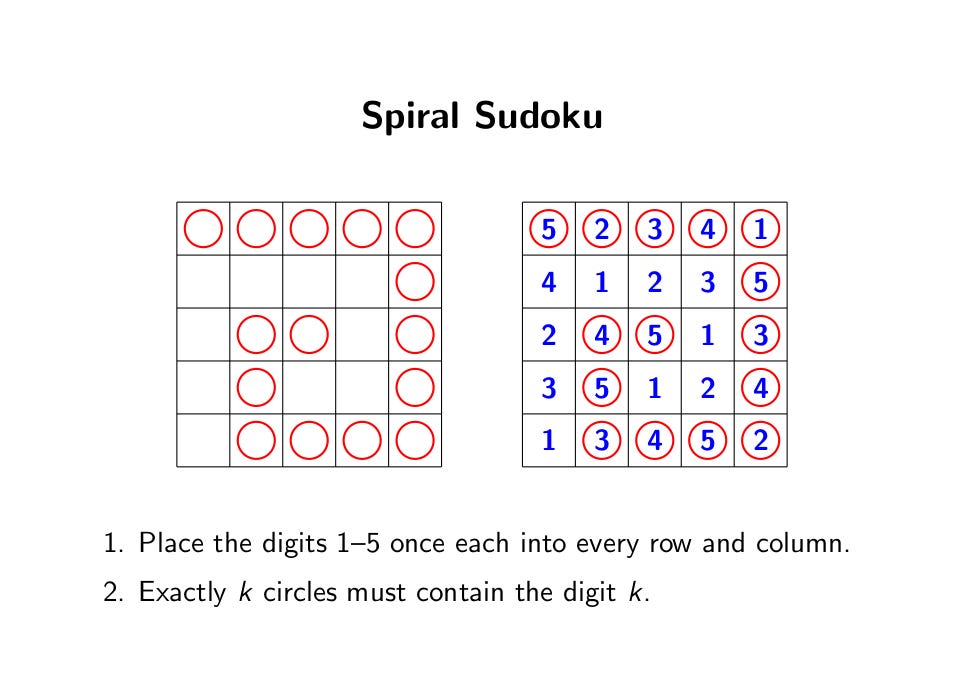 Suppose we have a 5×5 grid with 15 circled positions in a spiral shape as shown above. Is it possible to fill the grid with the digits 1 up to 5 in such a way that (a) each row and each column contains each digit precisely once, and (b) the circled digits include precisely one 1, two 2s, three 3s, four 4s, and five 5s? Although the short answer is “yes”…