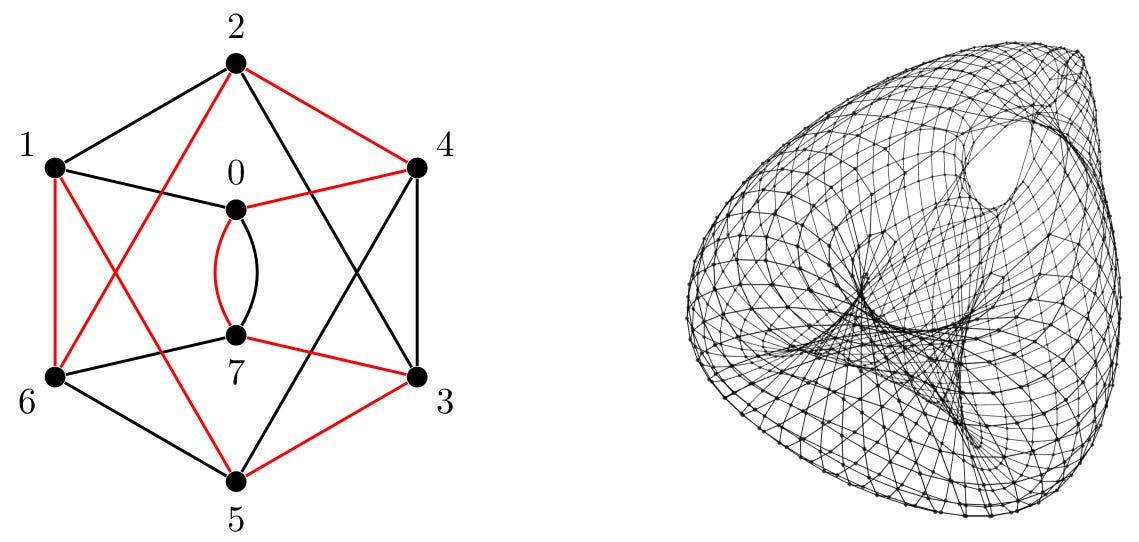 These binary numbers represent the sequence of fractions (0, ½, ¼, ¾, ⅛, ⅝, ⅜, ⅞, …). As with the Kronecker sequence, we can rank the first eight terms of the sequence in order, which produces the sequence (0, 4, 2, 6, 1, 5, 3, 7). This gives rise to the red edges in the graph above, with the black edges following the cycle (0, 1, 2, 3, 4, 5, 6, 7). The right half of the picture shows the case n=1024, which resembles a surface of some kind. Larger values of n give rise to even more complicated surfaces, like the one on the right of the top graphic.