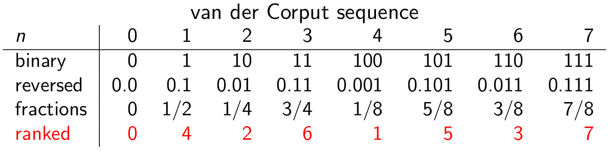 The main results of the paper by Chowdhury, Clément, and Horwitz concern a different sequence of numbers between 0 and 1 called the van der Corput sequence. To produce this sequence, we start with the sequence of natural numbers in binary: 0, 1, 10, 11, 100, 101, 110, 111, and so on. We then reverse the digits, and place the reversed digits after a binary point so as to make “decimals” but in base 2, which produces the sequence 0.0, 0.1, 0.01, 0.11, 0.001, 0.101, 0.011, 0.111, and so on.