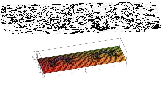 The Loch Ness monster drawing comes from Nomenclator aquafilium animantium by Konrad Gesner, and the plot of the Loch Ness monster surface is by Boriaj. Both pictures appear on Wikipedia.