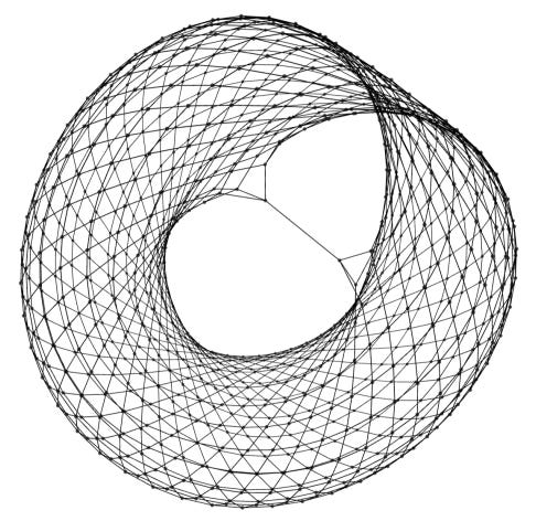 When n is much larger than 8, a geometric structure emerges from the Kronecker sequence graph, as shown above (with n=971) and also on the left of the top graphic. One of the results of the recent paper Obtaining the Chamanara Surface from the van der Corput sequence by Zawad Chowdhury, François Clément, and Max Horwitz is that these particular sequence graphs can be embedded in a torus. What this means is that it is possible to draw the graph, without crossings, on the surface of a torus, although in most cases it is necessary to remove an edge between n–1 and 0 in order for this to work.