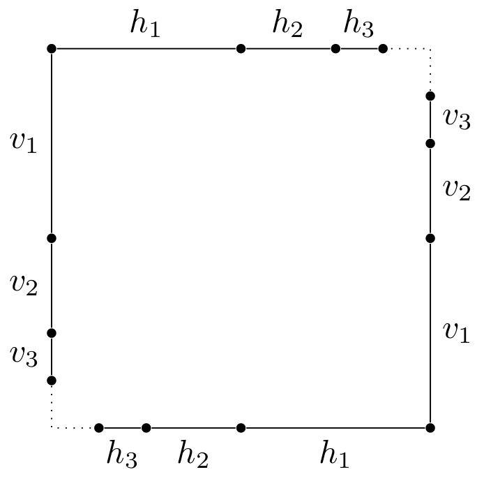 More precisely, we partition the boundary of the square into vertical segments vi and horizontal segments hi of length 2-i. Two vertical segments of the same length are then identified with each other, and the same goes for horizontal segments of the same length. For example, in the picture above, the left endpoint of h1 on the top edge is identified with the left endpoint of h1 on the bottom edge, and the top endpoint of v1 on the left edge is identified with the top endpoint of v1 on the right edge. The effect of this is that the top left corner of the square, the midpoint of the bottom edge, and the midpoint of the right edge are pinched together into the same point.
