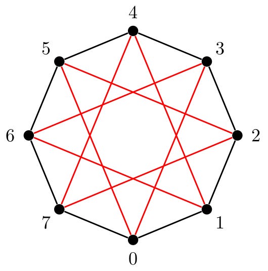 For each positive integer n, we can form a graph of vertices and edges called the Kronecker sequence graph. The example above shows the Kronecker sequence graph with n=8 vertices, labelled 0, 1, 2, 3, 4, 5, 6, 7. These vertices are connected in a cycle by black edges linking 0 to 1, 1 to 2, and so on, with 7 linked back to 0.