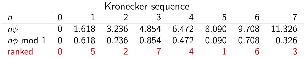 The golden ratio, φ=(1+√5)/2, is a famous example of an irrational number, which means that it cannot be expressed exactly as a ratio of two integers. The Kronecker sequence (nφ mod 1) is formed from the numbers (0φ, 1φ, 2φ, 3φ, …) ≈ (0, 1.618, 3.236, 4.854, …) by discarding the part of the number to the left of the decimal point to obtain (0, 0.618, 0.236, 0.854, …). The Kronecker sequence has no repeated entries precisely because the golden ratio is irrational.
